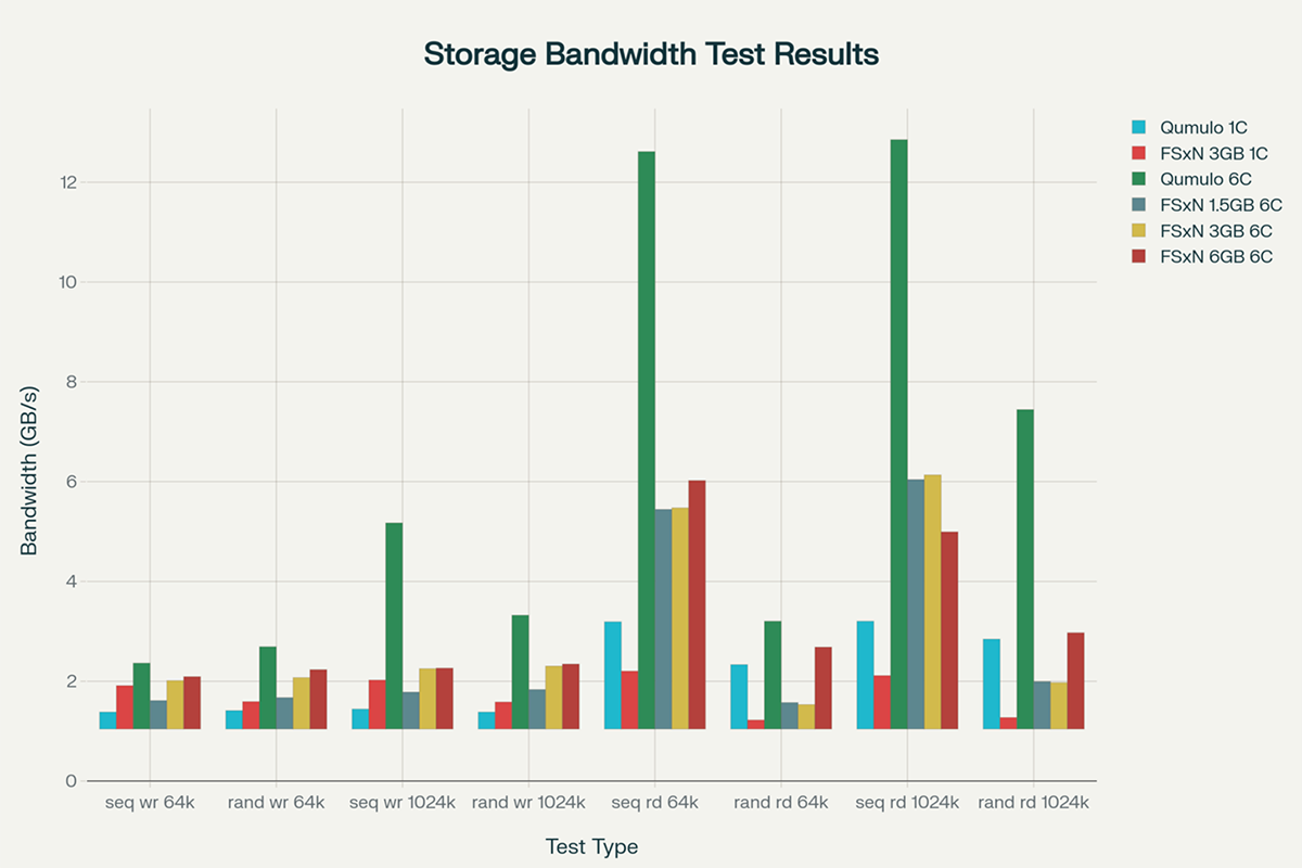 - Deployment: Qumulo stood up in ~5 minutes vs. FSxN’s ~19 minutes