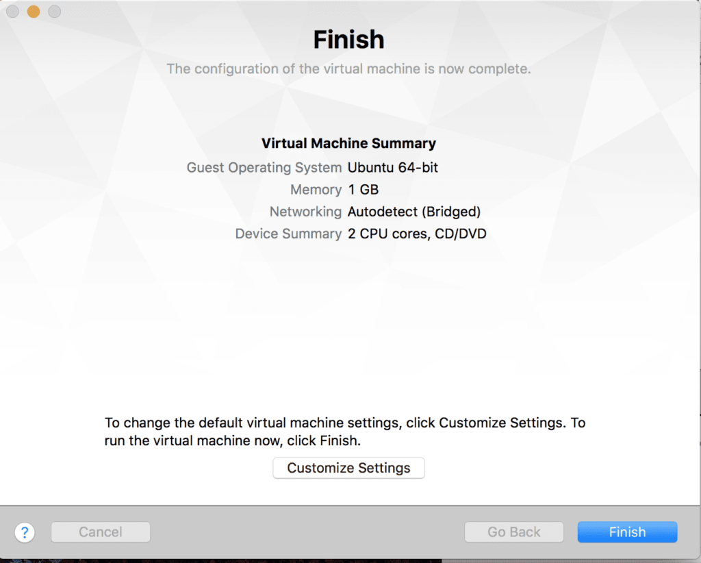 - When the process is complete, you’ll see a summary of the VM’s settings.