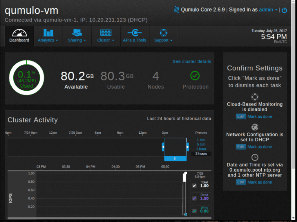 - Note the IP address, located at the top. You can use your browser to reach the dashboard. In this example, the URL is http://10.20.231.123.