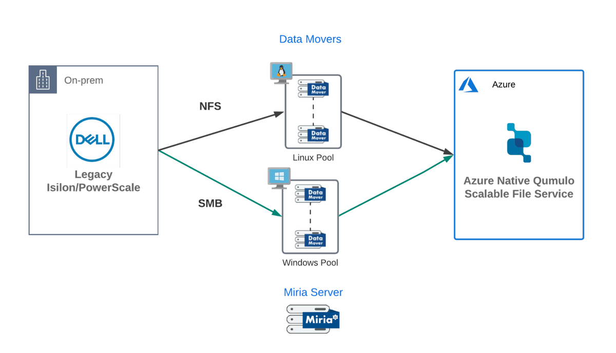 - The Miria Server manages the deployed Miria Data Movers. NFS workloads and SMB workloads require different OS deployments for the Data Movers. The Miria Server itself can be deployed on Linux or Windows OS.