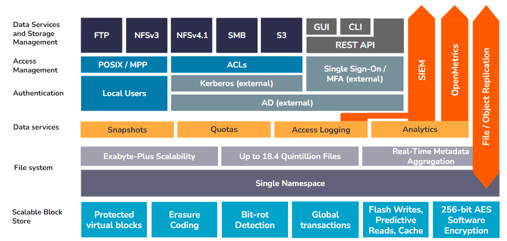 Qumulo’s modular architecture can be abstracted into a series of layers, with specific service controls and features bundled into each layer. These layers work together to support the scalability, performance, security, and reliability of the unstructured data on a Qumulo instance, as well as the Qumulo system itself.